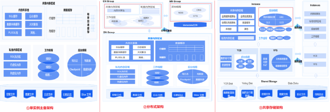 私有内存区域:包括SQL执行区以及SQL算子使用的虚拟内存,这部分内存区域在各个线程运行时分配使用,释放后才能被其它线程使用共享内存区域:包括SQL缓存、日志缓存等内存共享池和全局缓存、全局锁和全局队列等全局共享资源池、数据缓存区域以及有界加速缓存工作线程:处理客户端连接请求的线程,可以为会话专有模式或共享模式后台线程:写日志、写数据和checkpoint等数据库后台的工作线程。对于分布式架构,还有MDS元数据管理、CMS分布式集群管理和GTS分布式全局时间管理等线程;对于共享存储架构,还有共享集群间的同步消息处理、GRC全局资源访问控制、GLS全局锁服务和GCS全局缓存服务等专有线程。