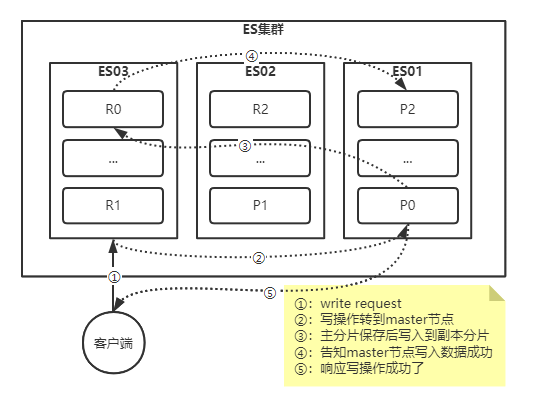 5、当所有的副本分片节点保存数据成功后,会告知"es03"节点写请求执行成功;
