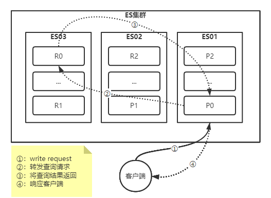 1、客户端可以请求任意集群节点(比如"es01"),此时我们称该节点为"协调节点(coordinating)";